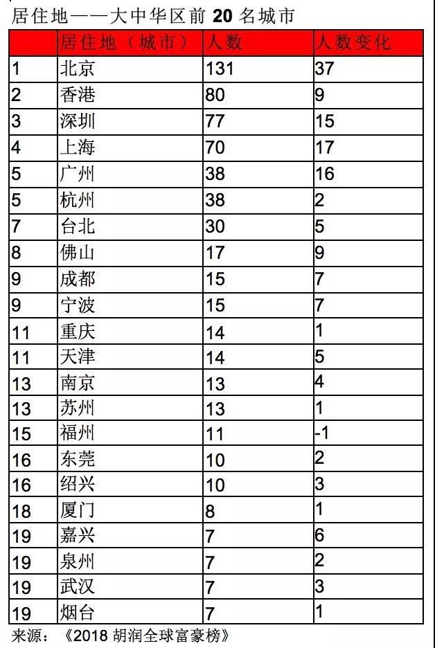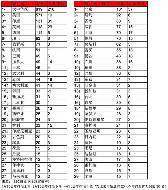 在上榜的十亿美金富豪中,大中华地区以819位第三年领先于571位的美国。大中华区和美国拥有全球一半的十亿美金富豪。印度今年表现不俗,反超德国重回第三。墨西哥和智利首次进入前20。北京第三年领先于纽约蝉联“十亿美金富豪之都”,比去年又增加37位,达到131位。胡润表示:“如今,在邻近的香港和深圳,十亿美金富豪的数量比整个加州都要多,相比之下,香港和深圳共有157人,加州有139人” 。广州新增16位,位列前十。排名前30的城市中,三分之一在大中华地区。仅有3个国家有两个或两个以上城市排名前20:中国、美国和印度。
