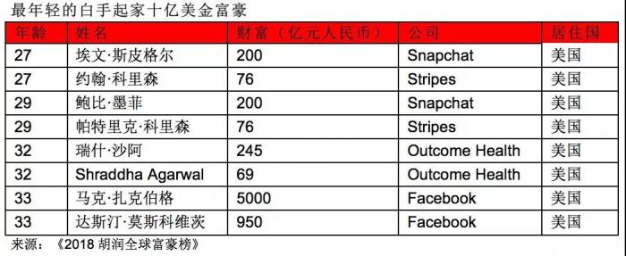 85位上榜富豪40岁或不到40岁,比去年增加7人。其中47人是白手起家,38人财富来源于继承。美国和中国诞生了最多的少壮派十亿美金富豪,分别拥有26人和24人,占了少壮派十亿美金富豪的60%以上。德国家族医疗耗材巨头博朗(B. Braun)拥有数量最多的少壮派富豪,共有8人。20%是女性。