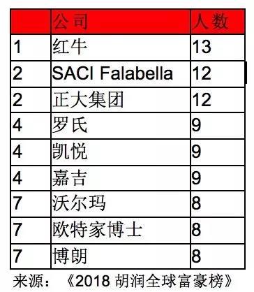 今年胡润全球富豪榜上诞生最多十亿美金富豪的公司是红牛,有13人上榜,其次是智利SACI Falabella百货公司和泰国正大集团,各有12人上榜。红牛的股东包括迪克·梅特舒兹和他的联合创始人许书标的11个孩子。