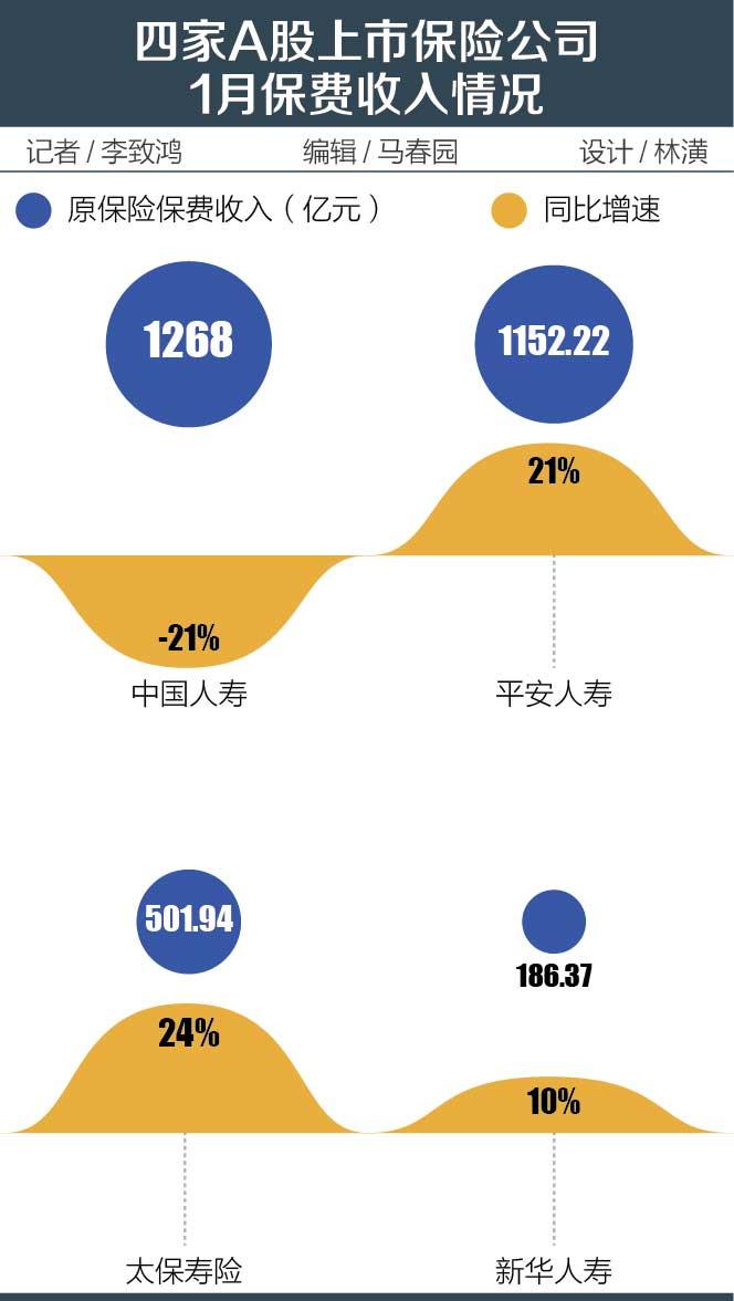 截至2月28日,四家A股上市保险公司已经悉数披露1月保费数据。其中,中国人寿原保险保费收入1268亿元,同比下降21%;平安人寿原保险保费收入1152亿元,同比增长21%;太保寿险原保险保费收入502亿元,同比增长24%;新华人寿原保险保费收入186亿元,同比增长10%。