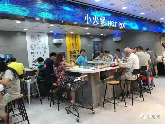 走进一家盒马鲜生,如同在逛超市的生鲜区,在这里,顾客们可以直接把商品取出来,扫码支付,直接带走又或者交给店家现场加工烹制,完了之后在公共餐台上享用。