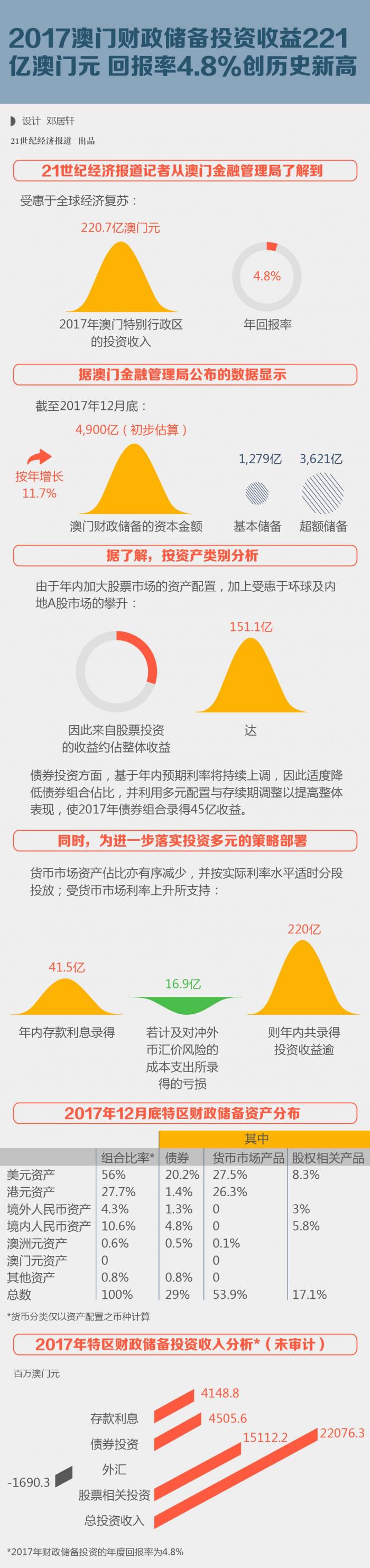 21世纪经济报道记者从澳门金融管理局了解到,受惠于全球经济复苏,2017年澳门特别行政区的投资收入为220.7亿澳门元(下同),年回报率达4.8%,均创下历年新高。