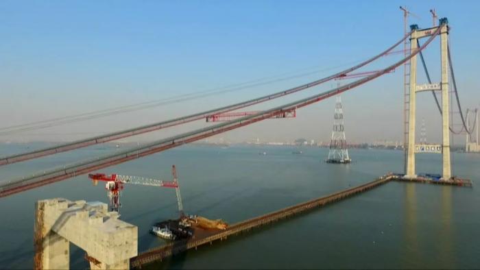 罗人昆说:“我们首次运用了LORA远程通讯技术,实现在整个索股架设过程中自动化、智能化 ,还有实时化的全程远程监测。在索股的牵引架设过程中,连续保持单日单幅架设6根,这个在同类似的跨径的悬索桥中施工中也是世界第一。”