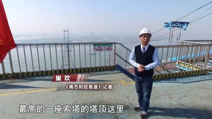 现在记者所在位置是在虎门二桥中最高的一座索塔的塔顶,这座索塔塔高达260米,也就是相当于87层楼的高度,比广州市中信大厦还要高出90米的高度。虎门二桥的钢箱梁大桥也是号称“世界第一跨”,虎门二桥工程也是广东省高速公路网规划中,连接广州和东莞的重要东西向通道。路线起于广州市南沙区,并先后跨越大沙水道、海鸥岛、坭洲水道后,穿越虎门港进入东莞市沙田镇,终点与广深沿江高速公路相接。