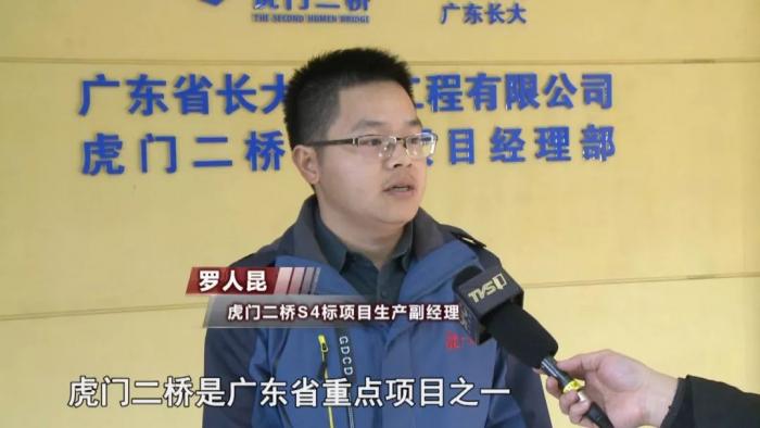 虎门二桥S4标项目生产副经理罗人昆表示:“虎门二桥是广东省重点项目之一,项目全长是12.89公里,项目起点是广州市南沙区的东涌镇,按照8车道高速公路技术标准来设计,设计时速是100公里/每小时。全桥共设4个互通立交,东涌互通、海鸥岛互通、骝东互通,还有东莞侧的沙田立交互通。”