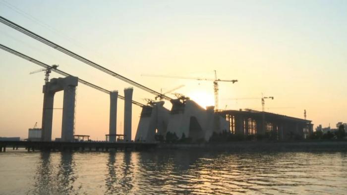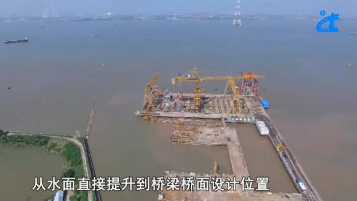 罗人昆说:“上部构造施工与我们塔码引桥之间的交叉施工,再有一个就是我们即将面临的钢箱梁吊装过程中跨航道,与海事的10万吨级航道,也有5千吨的航道交叉施工的组织。从水面直接提升到桥梁桥面设计位置,钢箱梁单片重量,常规钢箱梁大约就是240吨左右。”