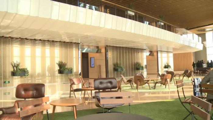 在东塔进出不得不提这里的电梯,这里拥有世界上速度最快的电梯,可以达到20米/秒的速度。从首层到95楼的时间也只需22秒,这个速度是超过上海中心和台北101的电梯速度,成为世界最快,在电梯的设计上还有一大亮点,就是双厢的设计。在本层开门的同时楼上的电梯门也是打开的,这样的运营速度和模式,可以减少很多等待的时间。通过镜头还可以看到,电梯内是没有任何楼层按钮,只需要通过记者手上的这张智能卡,就能识别我所要到达的楼层。