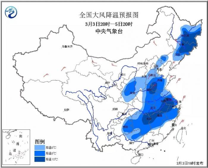 3、中央气象台预计,3日晚间至5日,冷空气自西向东将影响我国中东部地区。受其影响,东北地区大部、华北中南部、黄淮、江淮、江南中北部等地有6~8℃降温,部分地区降温可达10℃以上。