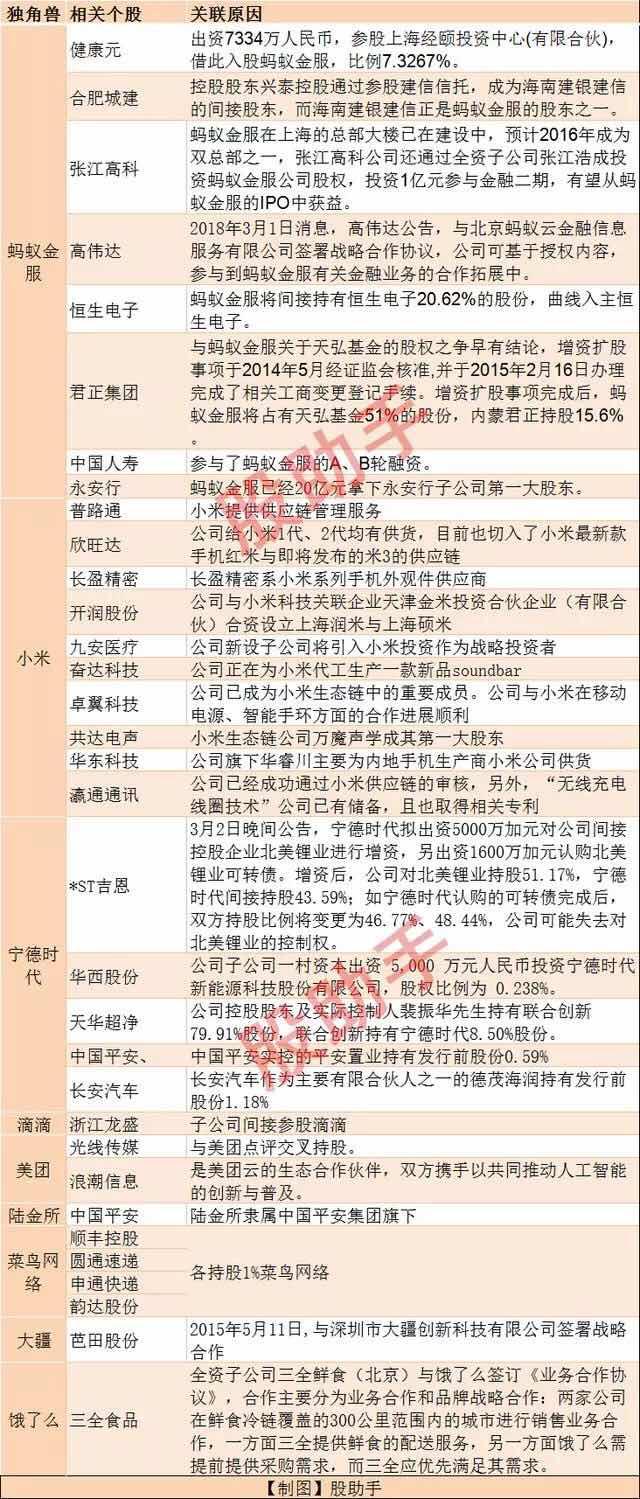 由于独角兽企业较多,而炒股无疑是要炒龙头,在此对上表中估值超过500亿元的独角兽公司相关概念股作盘点,具体见下表,供大家参考。