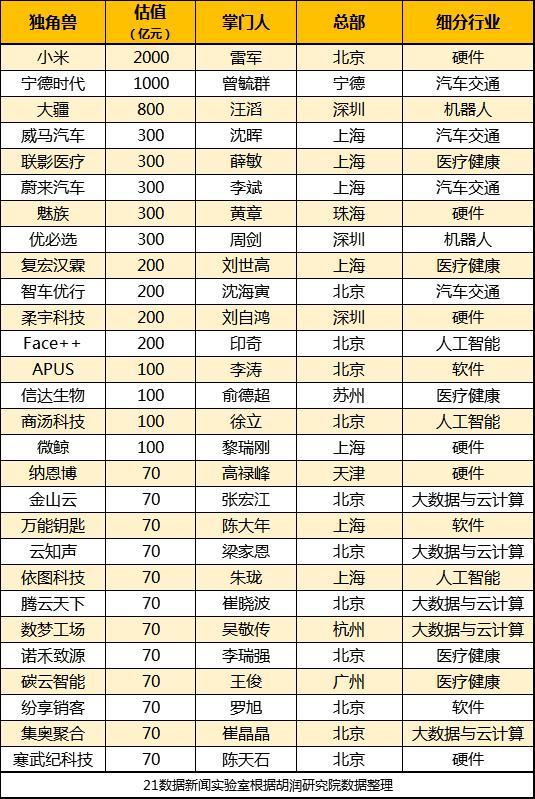 胡润研究院数据显示,截至2017年11月30日,中国独角兽企业总数达120家,68家估值在100亿元以上,以下是估值超过500亿的中国独角兽企业。