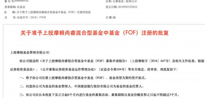 证监会官网最新披露的信息显示,继首批6只公募FOF获批后,第二批3只FOF也于3月6日获得了最新批文,分别是前海开源裕源混合型基金中基金(FOF)、上投摩根尚睿混合型基金中基金(FOF)以及中融量化精选混合型基金中基金(FOF)。