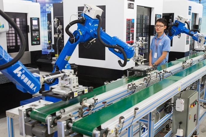 劲胜智能是东莞智能制造的典型代表,其生产车间的智能制造设备联网后能自动运行。图为技术人员在一旁观察设备运行情况。(南方日报记者 孙俊杰 摄)