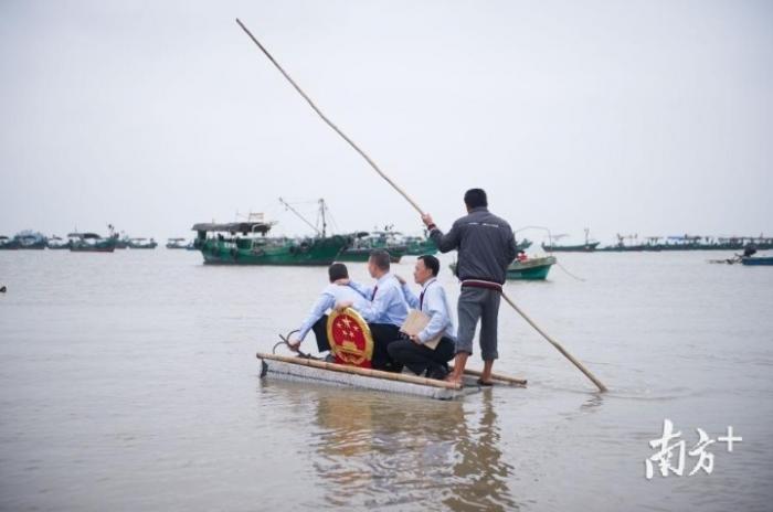 在广东湛江,硇洲人民法庭3名法官乘坐小舟前往渔船开庭。(南方日报记者 张梓望 摄)