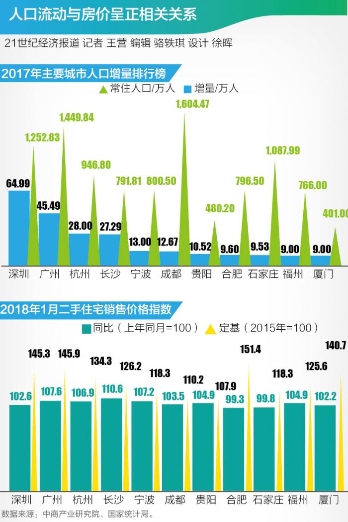 人口流动与房价呈现正相关。根据国家统计局发布的2018年1月70个大中城市二手住宅销售价格指数,在2017年人口增量前16位的城市中,除石家庄、合肥外,主要人口流入城市的二手房价格都是同比上升。