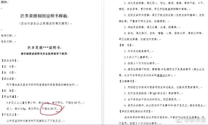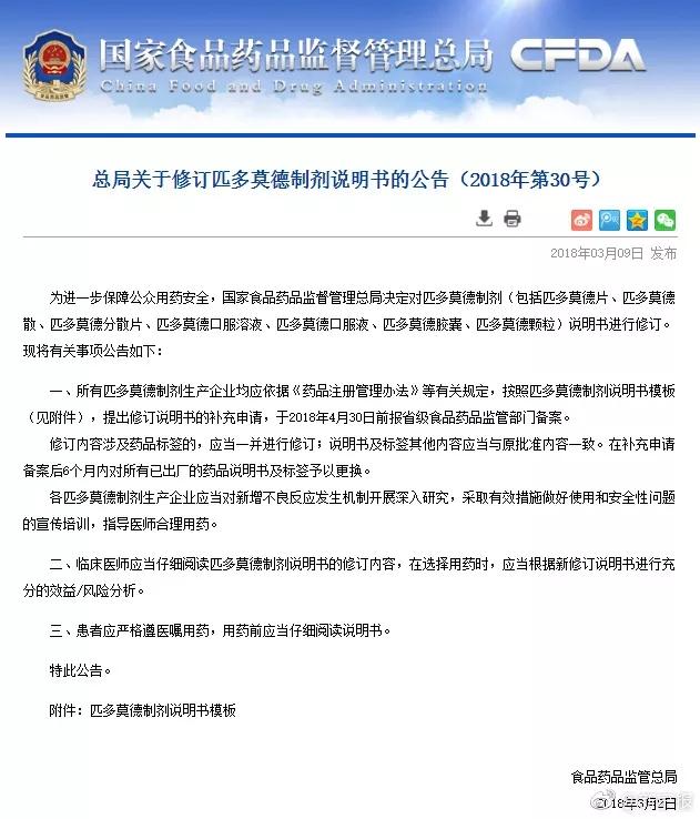 国家食药总局要求,所有匹多莫德制剂生产企业均应依据《药品注册管理办法》等有关规定,按照匹多莫德制剂说明书模板,提出修订说明书的补充申请,于2018年4月30日前报省级食品药品监管部门备案。
