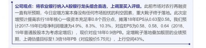 并且根据农业银行同时披露的2017年业绩快报,申万宏源证券认为,农业银行2018年PB应该上调1.3倍(对应股价5.75元/股),较目前最新的股价4.03元/股,具有43%的上行空间。