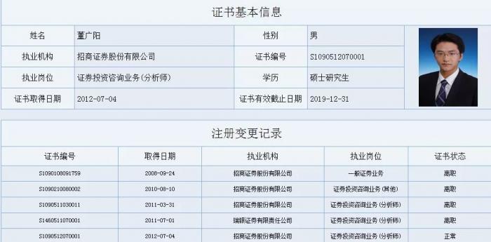 中证协系统显示,董广阳2008年取得从业资格后,2011年曾短暂就职瑞银证券几个月,其他都就职于招商证券,算是招商证券老人。