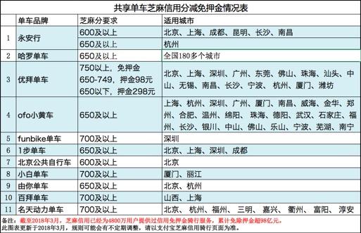 据芝麻信用提供的数据,截止2018年3月,已有哈罗等十余家共享单车接入芝麻信用免押金,累计已为近50个城市4800万用户减免押金超过98亿元。