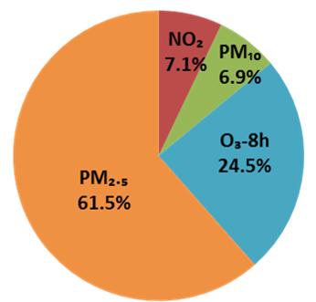 从污染物情况来分析,2018年2月全省城市主要空气污染物为细颗粒物(PM2.5),其作为每日首要污染物的比例为61.5%,其次为臭氧日最大8小时均值(O₃-8h), 占比为24.5%。2月PM2.5全省平均浓度为44微克/立方米,各市平均浓度范围在30-53微克/立方米之间。