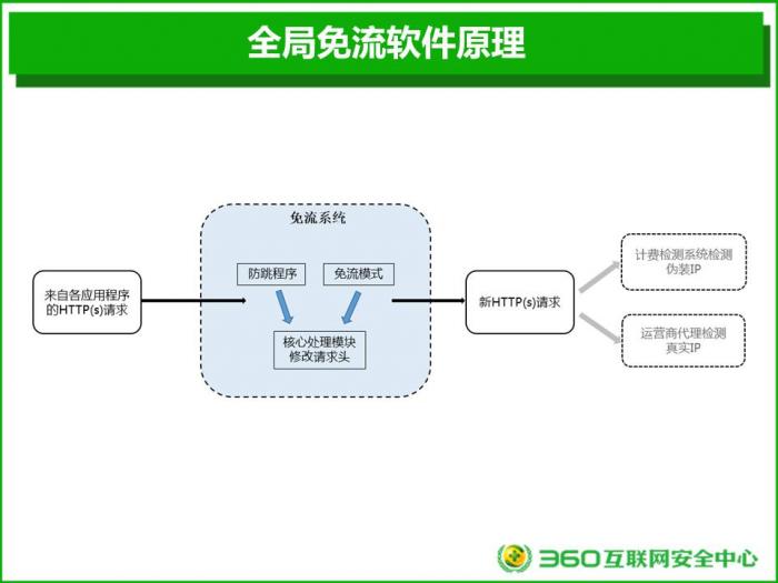 《报告》指出,免流软件从字面上不难理解,就是让用户不消耗或少消耗数据流量即可访问互联网的软件。免流IP、移动运营商代理服务器与计费检测系统的分离,是免流软件存在必须依赖的两个因素。免流软件的本质是用户端的流量欺骗,而实现欺骗的基本原理就是修改设备上发起的网络请求,用伪造的请求欺骗运营商计费检测系统从而实现免流。