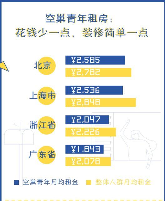 闲鱼租房数据显示,过去一年,闲鱼租房人群中,广东人占比最大,达16%;90后成租房主流人群,占65%;另外,租房群体中有32%为空巢青年。所谓空巢青年,即单身、独自在异乡打拼的年轻人。基于租房大数据,闲鱼对空巢青年这一特殊群体的生活状况进行了分析。数据显示,北京地区租房的空巢青年人均月租金为2585元,低于北京平均月租金水平2782元。此外,上海空巢青年的平均月租为2536元,浙江空巢青年为2047元,广东则为1843元,不同程度低于该地区的平均房租水平。在装潢上,有半数空巢青年选择简单装修。