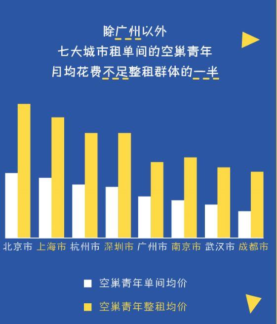 其实,空巢青年并非千篇一律。同样是空巢青年,在租房选择上有整租和租单间的区别,部分空巢青年通常会选择厨房、客厅、卫生间一应俱全的整套房子,而也有人会选择租用一整套房子中的一间卧室,通常需要和他人共享卫生间、厨房等。闲鱼租房的空巢青年中,有47%只租一个单间。租用单间的群体月均花费为每月1200元,而整租群体月均花费为2200元,其中,在北京、上海、广州、深圳、杭州、南京、武汉、成都这几大城市,租单间普遍可省下相当于整租一半的钱。其中,成都空巢青年整租的比例最高,为71%。而北京空巢青年中,七成选择租不带独立卫生间的房间。同是空巢青年,有人还在生存,有人选择生活。闲鱼租房数据显示,有空巢青年住着深圳福田130平的整套房,花费4.7万元/月,另一边,也有人租了江苏徐州求职公寓的一个床位,300元/月。