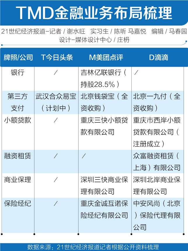 继BATJ之后,今日头条、美团点评、滴滴成为三大新兴互联网巨头,业内称之为“TMD”,借助流量和场景等优势,近年来纷纷涉足金融领域。
