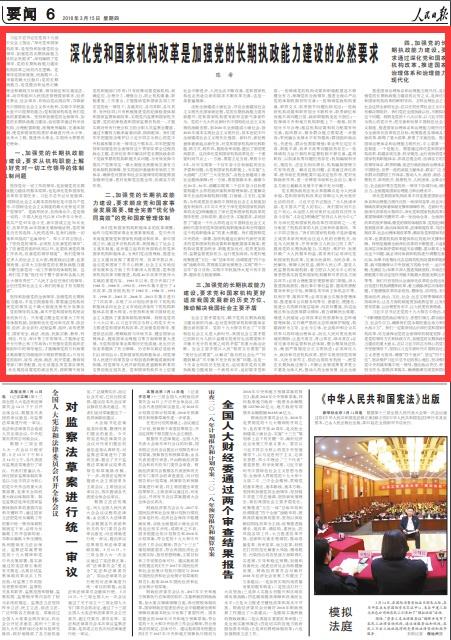 习近平总书记在党的十九大报告中指出,要“不断增强党的政治领导力、思想引领力、群众组织力、社会号召力,确保我们党永葆旺盛生命力和强大战斗力”。我们一定要深刻认识深化党和国家机构改革,对完善保证党的全面领导的制度安排、改进党的领导方式和执政方式、加强党的长期执政能力建设的重大意义,在以习近平同志为核心的党中央坚强领导下,坚持以习近平新时代中国特色社会主义思想为指导,增强“四个意识”、坚定“四个自信”,坚决维护习近平总书记的核心地位,坚决维护党中央权威和集中统一领导,强化政治责任,勇于担当作为,狠抓改革落实,确保圆满完成党和国家机构改革各项任务!