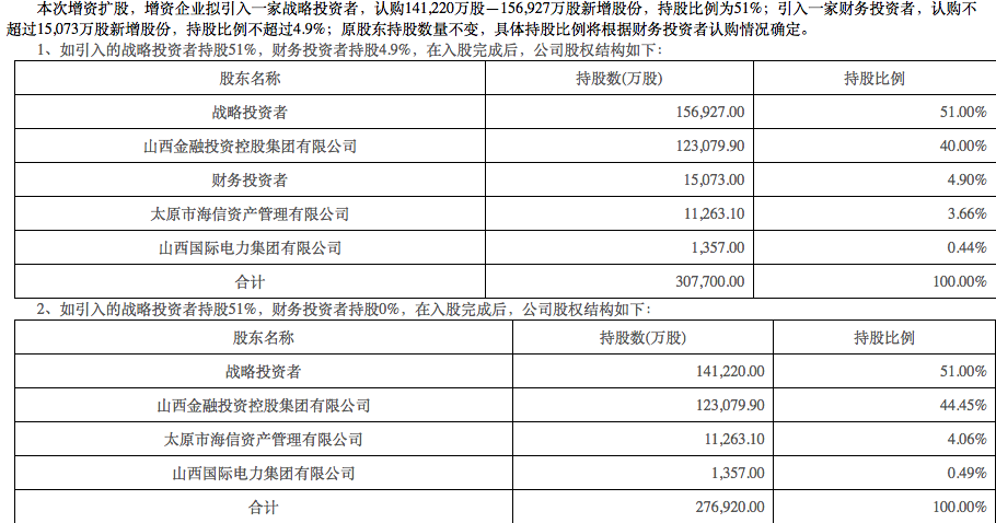 本次山西信托拟引入一家战略投资者,认购14.12—15.69亿股新增股份,持股比例为51%;引入一家财务投资者,认购不超过1.51亿股新增股份,持股比例不超过4.9%;原股东持股数量不变,具体持股比例将根据财务投资者认购情况确定。