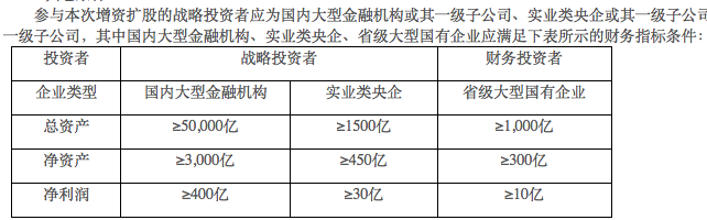具体而言,战略投资者若为国内大型金融机构总资产超5万亿,净资产超3000亿,净利润超400亿;若为实业类央企总资产超1500亿,净资产超450亿,净利润超30亿。