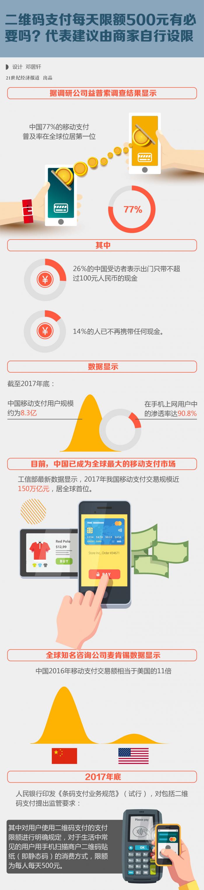 2017年底,人民银行印发《条码支付业务规范》(试行),对包括二维码支付提出监管要求,其中对用户使用二维码支付的支付限额进行明确规定,对于生活中常见的用户用手机扫描商户二维码贴纸(即静态码)的消费方式,限额为每人每天500元。