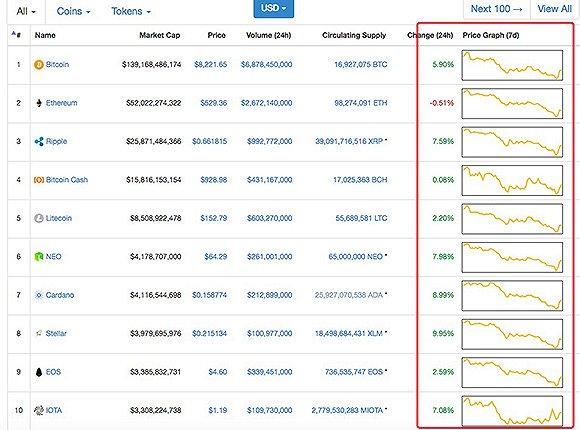 △前十交易货币价格趋势变化图。图片来源:coinmarketcap