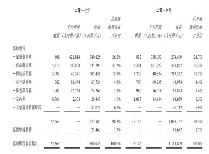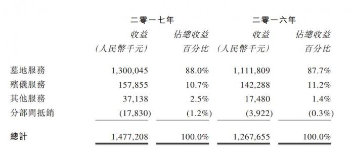 福寿园主要有三大业务,分别是墓地服务、殡仪服务及其他服务。但是公司88%的收益都由墓地服务贡献,2017年其在墓地销售服务产生收益是12.78亿元,墓园维护服务收益则仅为2246万元,墓地服务收益合计13亿元。