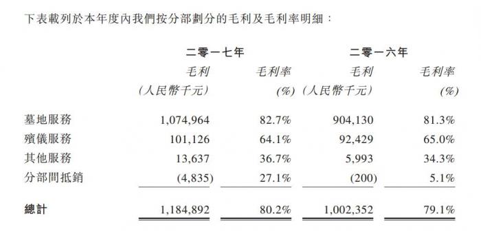 作为公司核心业务,墓地服务业的毛利简直高到令人发指,近四年基本维持在80%左右。2014年、2015年、2016年、2017年,公司墓地服务的毛利率分别达到82.2%、79.7%、81.3%、82.2%。
