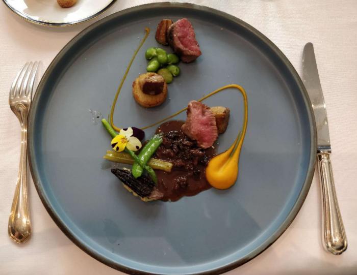 羊肉鹅肝组合配羊肚菌汁核桃泥