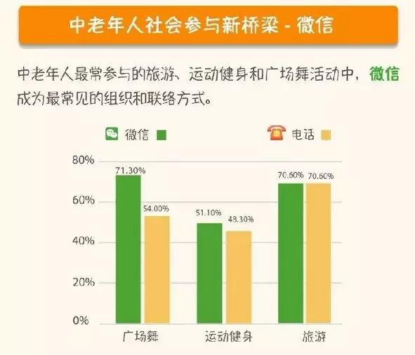 这些接受调研的微信中老年用户中,75.8%会上网看新闻资讯,约半数人会通过关注公众号或上网搜索的方式获得自己感兴趣的信息。98.5%的受访者会使用微信聊天,而发红包、朋友圈点赞、发小视频、图片等功能更是被大多数人“玩转”了。