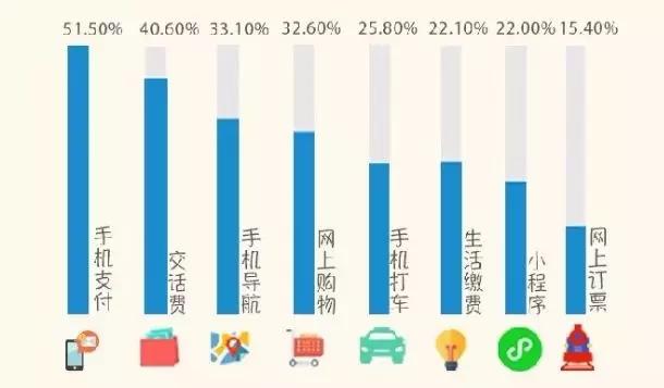 与之相对应,被年轻人所热衷的各项网上便捷功能也渐渐融入到中老年人的生活当中。超过半数中老年人使用手机支付,会使用手机导航和打车服务的占33.1%和25.8%。微信也超过了电话和当面沟通,成为他们最常用的联络方式。