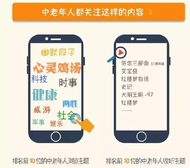 报告也显示,中老年人浏览网络内容排名最靠前的是与慰藉心灵、调节情绪有关的心灵鸡汤和幽默段子,分别有76.5%和72%的中老年用户浏览了这些主题。最为关心的资讯以国内时事和军情以及养生保健为主要内容。
