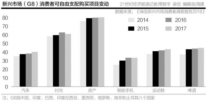 “虽然不是所有的新兴经济体都会很快、顺利地实现这种转变,但是我很惊讶地发现,G8国家的变化非常明显。”Kersley引用《调查2018》的数据称,在汽车、时尚、度假、智能手机、运动鞋、啤酒和投资品等项目中,增长的趋势很强烈。