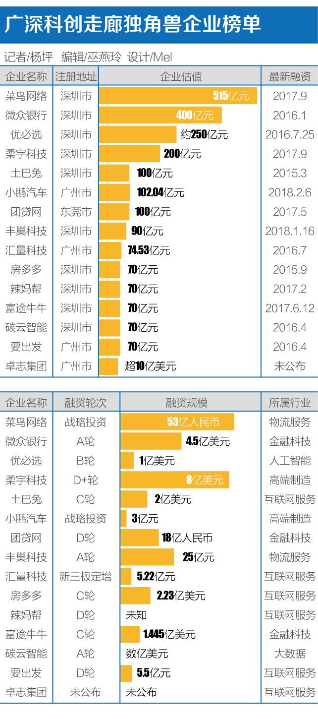 21世纪经济报道记者通过Wind数据、广州市政府、IT桔子、《2017胡润大中华区独角兽指数》等公开信息,结合企业访问结果,整理出了目前广深莞三地独角兽企业榜单。