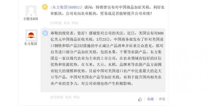 对此,3月23日下午,有投资者在上证e互动向东方集团(600811.SH)提出有关问题:“特朗普宣布对中国商品加征关税,利好农业板块。公司布局农业板块,贸易战是否能够提升公司业绩?”