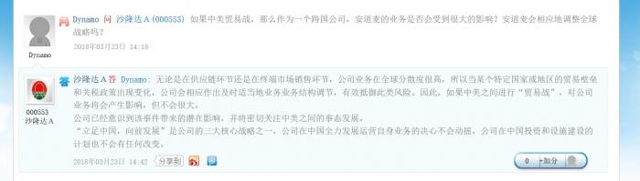 “因此,如果中美之间进行‘贸易战’,对公司业务将会产生影响,但不会很大。公司已经意识到该事件带来的潜在影响,并将密切关注中美之间的事态发展。”沙隆达A称。
