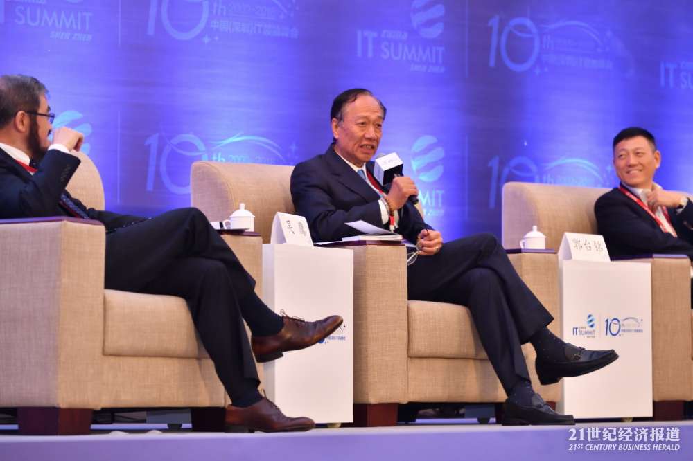 富士康科技集团董事长郭台铭在主题为“数字中国与未来世界”的高端对话中发言。他说,工业互联网强调的是跨学科的分析、技术融合的分析、数学跟大数据的分析、机器学习。未来,富士康工业互联网是物与物的关系、物与机器的关系,物与物之间机器跟机器的语言要能够通。