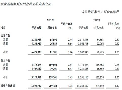 2017年,农行净利息收益率2.28%,净利差2.15%,分别较上年上升3个和5个基点,农行表示,主要是该行进一步巩固稳定、低成本存款优势,活期存款占比上升,加上此前付息率较高的部分定期存款到期后重新定价,存款平均付息率较2016年下降13个基点。