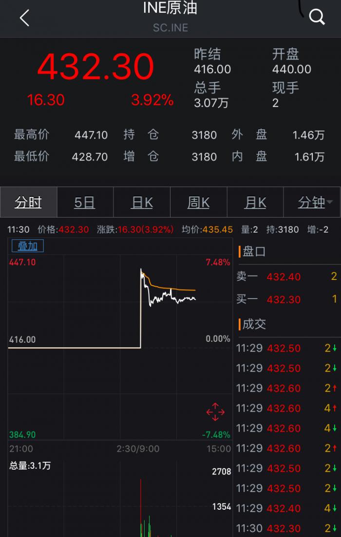 截至中午11点30分收盘,INE原油报收432.3元/桶。业内人士评论称,原油期货的总体走势平稳,成交情况也达到预期。