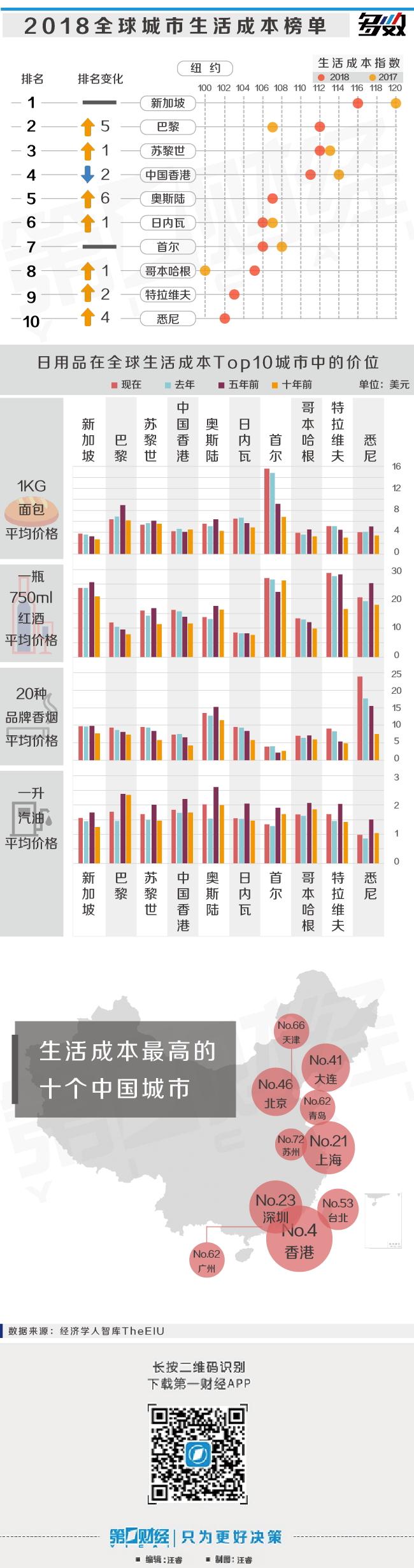 近日,《经济学人》公布了最新的全球生活成本最高的城市榜单,选取了全球90多个国家的130多个城市。其中,新加坡、巴黎、苏黎世、香港和奥斯陆排名前五,纽约、东京等过去常被认为生活成本最高的城市跌出了前十。除了在这次排行榜中位列第四的香港,中国上海、深圳排在了20名出头,其次是排在41名的大连,而北京位列大连之后,位居46名。