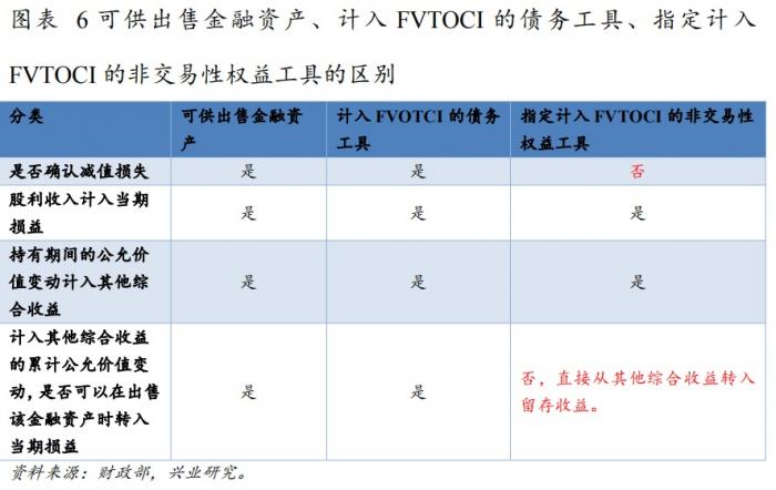 应当特别指出的是,指定计入FVTOCI 的非交易性权益工具,在收入确认上与可供出售金融资产、计入FVOCI的债务工具都存在差异。(1)指定计入FVTOCI 的非交易性权益工具无需计提减值损失,而后两者都需要计提减值损失。(2)指定计入FVTOCI的非交易性权益工具,持有期间计入其他综合收益的累计公允价值变动,在出售该金融资产时,不允许转入当期损益,直接从其他综合收益转入留存收益;而对于后两者,持有期间计入其他综合收益的累计公允价值变动,在出售该金融资产时,转入当期损益。这意味着,一旦企业决定将某项权益工具投资指定计入FVTOCI,该金融资产持有期间的公允价值变动(包括出售资产的资本利得),都无法在利润表上体现为当期利得或损失,只能直接计入所有者权益;仅有股利收入计入当期损益。