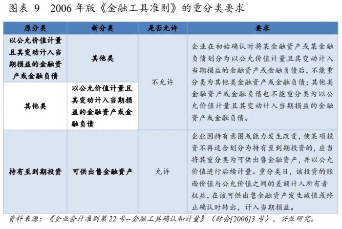 2006年版《金融工具准则》对于FVTPL与其他类金融资产之间的重分类做出了禁止性的规定,仅允许将“持有至到期投资”重分类为“可供出售金融资产”。