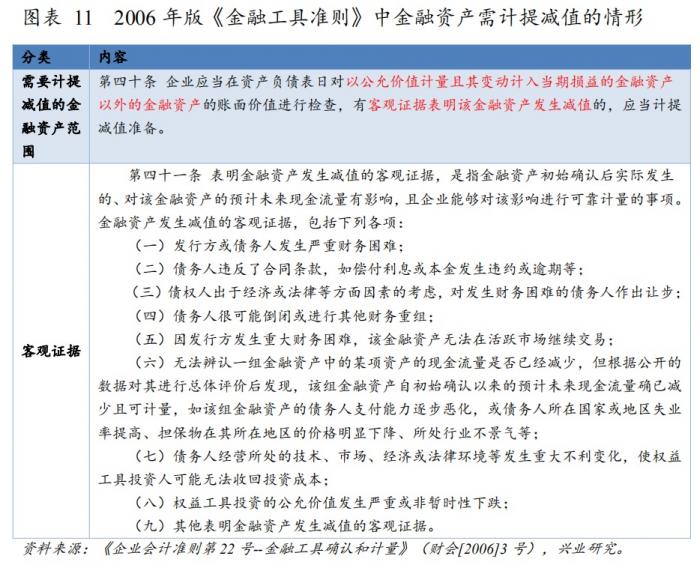 从计提减值的科目来看,在2006年版《金融工具准则》中,除FVTPL以外的科目,都需要计提减值;在2017年版《金融工具准则》中,“摊余成本计量的金融资产”和“计入FVTOCI的债务工具”需要计提减值,FVTPL和“指定计入FVTOCI的非交易性权益工具”无需计提减值。