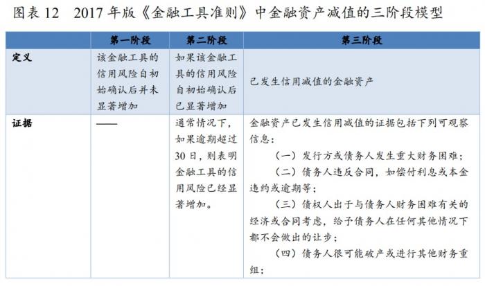从计提减值的资产范围来看,2006年版《金融工具准则》中,只有“客观证据表明该金融资产发生减值”,才要求计提减值;而2017年版《金融工具准则》中,引入了“预期信用损失”的概念和所谓的“三阶段模型”,要求对于未发生信用减值的金融资产,也要计提信用减值损失,在三阶段模型中,第三阶段大致对应2006年版《金融工具准则》中要求减值的情形,所以整体而言,计提信用减值损失的资产范围扩大。